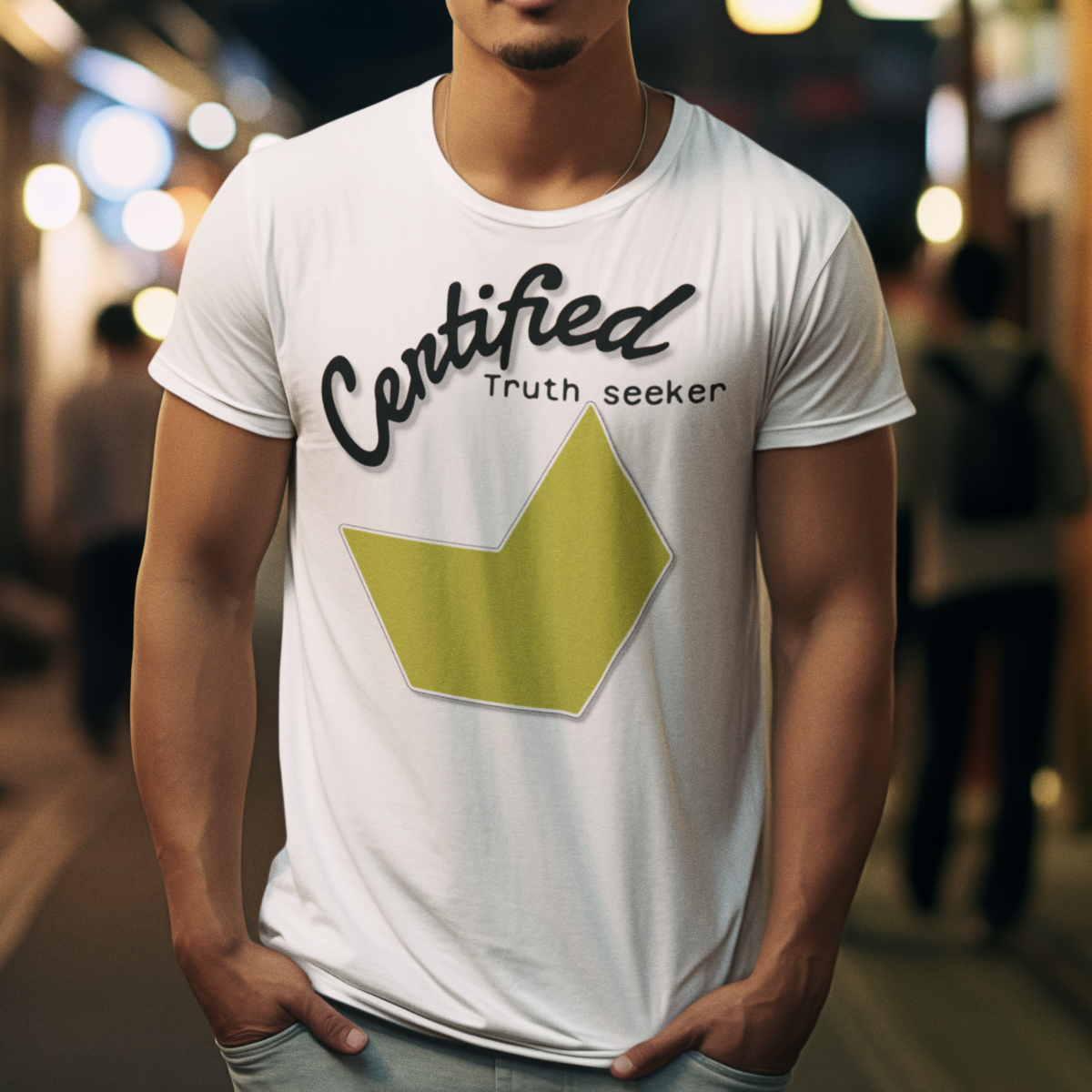 A lightweight crew-neck tee that balances crisp, confident design with everyday comfort. The soft ring-spun cotton feels gentle against the skin while the clean “Certified — Truth seeker” graphic and geometric accent give the shirt a thoughtful, understated edge. Wear it as a quiet statement — for wandering city streets, long café conversations, or meetups with fellow curious minds. The breathable fabric and classic fit make it easy to layer under a jacket or wear solo on warmer days, while the tear-away label and reinforced collar keep it feeling tidy hour after hour.