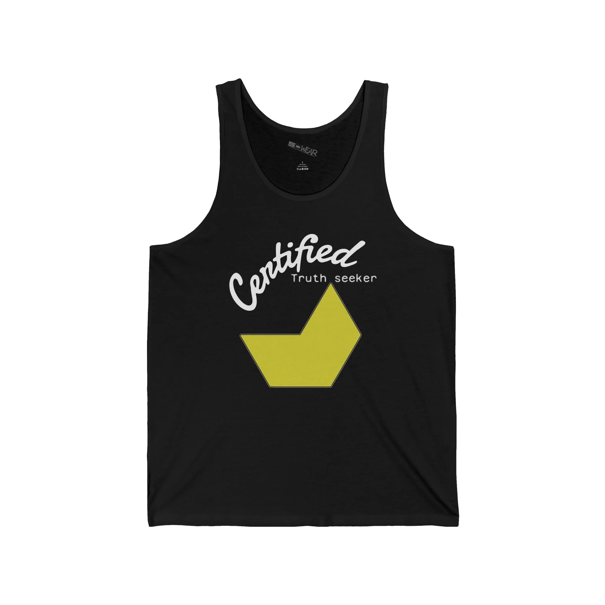 Light and airy, this tank feels like a quiet nod to curiosity. The soft white fabric carries a simple, hand-lettered "Certified truth seeker" above a geometric, mustard-gold emblem — a subtle badge for anyone who calls themselves a truth seeker. Wear it on slow morning walks, at outdoor talks, or layered under a linen shirt for a coffee shop brainstorming session. The cut sits close to the body without clinging, moving easily from laid-back weekends to warm-weather meetups. It’s unpretentious, breathable, and made to fade into the background while the ideas you chase stand forward.