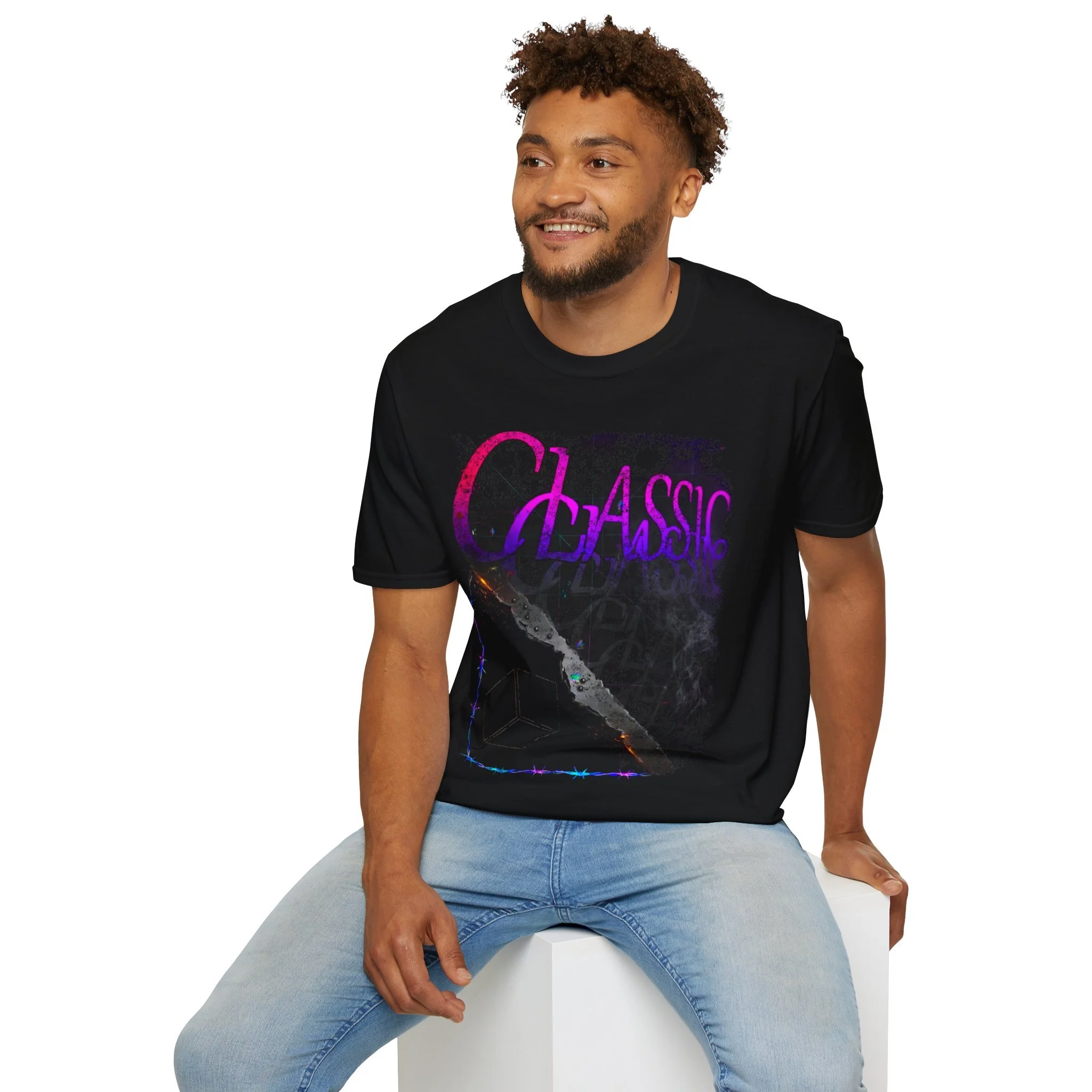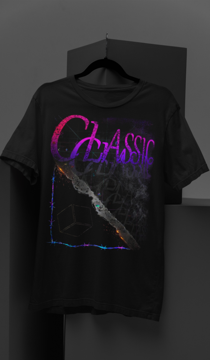 A lightweight black tee with a moody, retro-futurist print that reads “CLASSIC” in neon-magenta and purple over a distressed, marble-like diagonal slice and subtle smoke texture. The design sits inside a faint iridescent frame, giving the shirt a worn-vintage vibe with modern, synthwave energy. Wear it for late-night city walks, record-store hangs, or layered under a denim jacket for an effortless, nostalgic look. Soft ring-spun cotton keeps the fit breathable and comfortable from spring into cooler evenings, while the elastic ribbed collar and taped shoulders hold shape through repeated wear. This shirt speaks to anyone who loves faded glamour, analog textures, and music-tinged aesthetics.